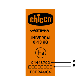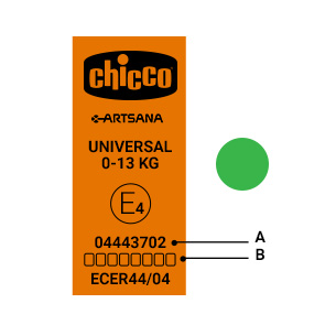Per poter correttamente identificare il prodotto ti chiediamo di individuare sul seggiolino l'etichetta di omologazione arancione e di compilare i campi indicati.